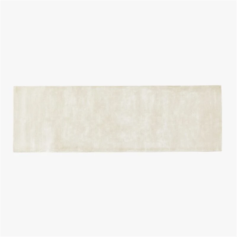 Woven from 100% TENCEL™ Lyocell, ivory runner rug offers a super-soft finish with rich texture and dynamic tonal highs and lows. Known for their natural comfort, sustainable TENCEL™ Lyocell fibers are durable with a subtle sheen for a lush, velvety feel underfoot. CB2 exclusive.