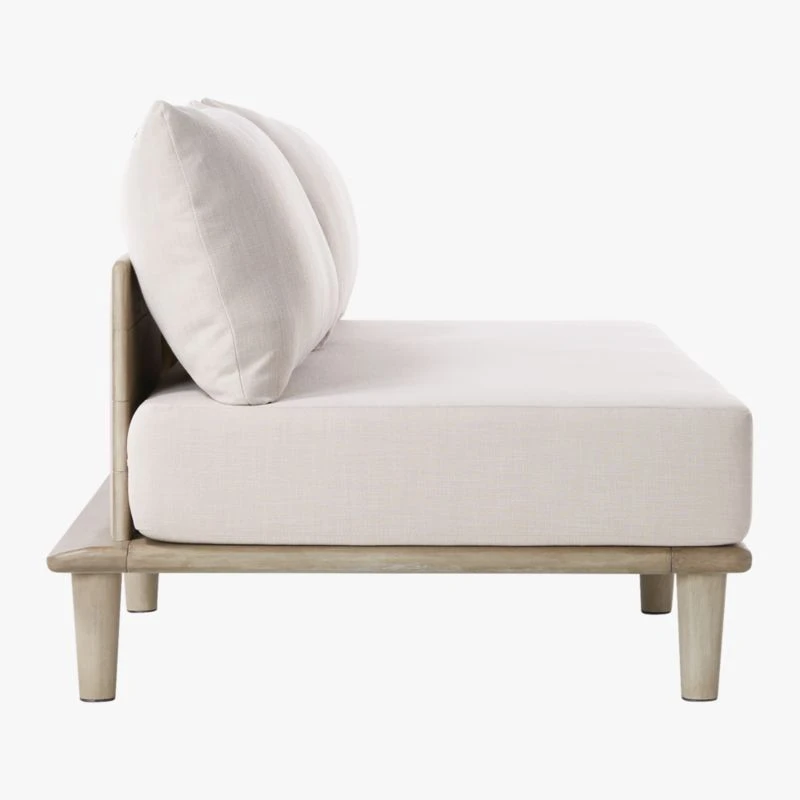 Monotone beauty lays out a perfect place to bask in the sun. Designed by Jannis Ellenberger, loveseat layers three overstuffed, grey-washed cushions (one seat, two back) on a grey-washed mahogany platform base. Modular seat pairs with armless or corner chair for lounging in any arrangement. Learn about Jannis Ellenberger on our blog. CB2 exclusive.