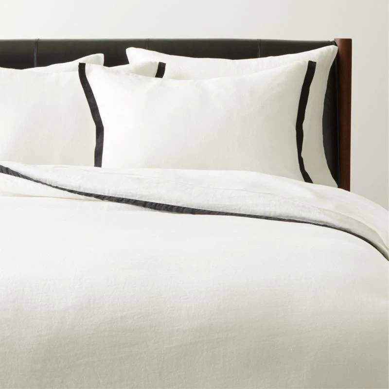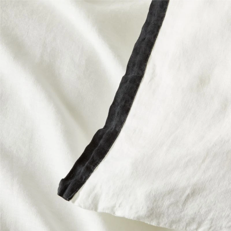Made in Portugal from exceptionally durable European flax fibers, OEKO-TEX ®-certified linen is woven into a timeless white duvet cover and shams that become softer with each wash. Remarkably breathable and moisture-wicking, linen is a dream for summer nights and those who sleep hot. Black border detail gives the duvet cover a modern finish. CB2 exclusive.