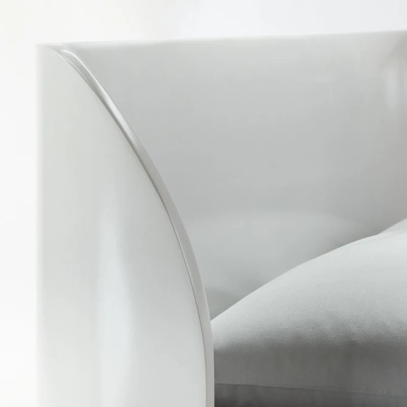 “In the very first room I was allowed to design for myself, I had a white enamel bed,” says Kara Mann. “This was like trying to reinterpret that, but a little more grown up.” Solid bed frame with rounded, seamless edges is finished in bright white lacquer for a distinctly modern look. CB2 exclusive.