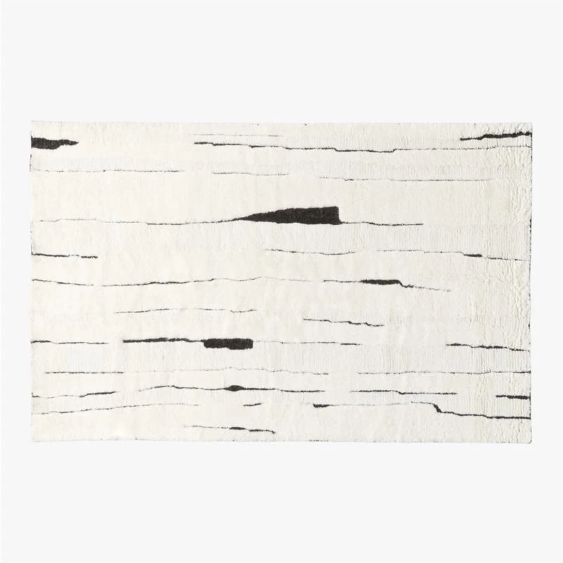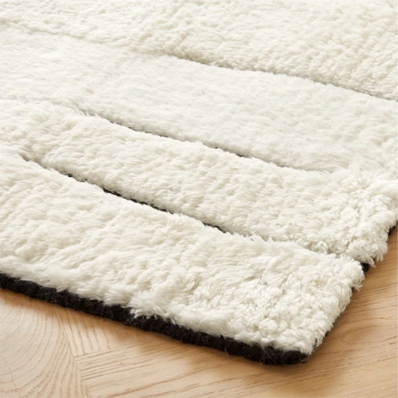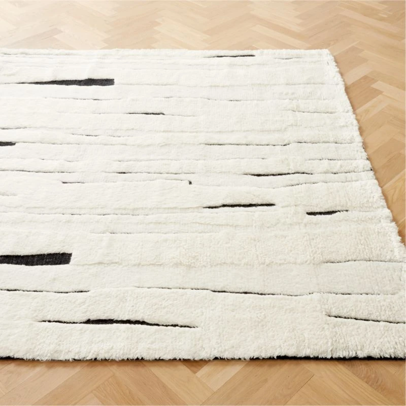 Hand-knotted from thickly spun New Zealand wool, lush Moroccan shag rug is finished with abstract stripes of high-low texture in high-contrast black and white. CB2 exclusive.
