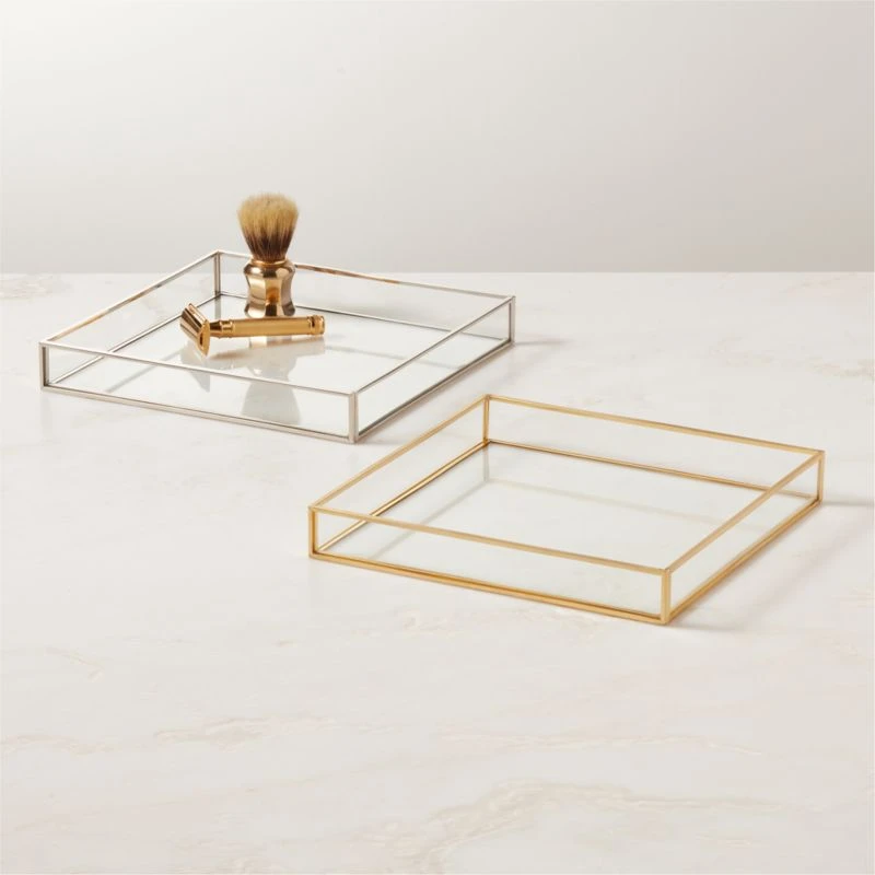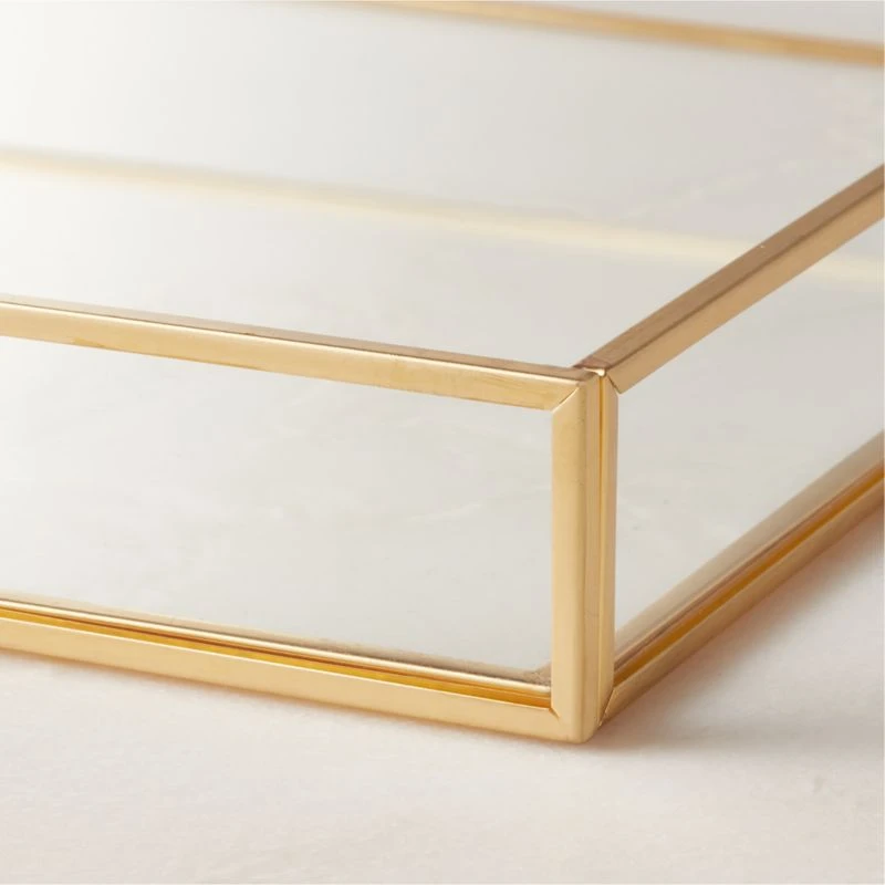 Rectangular vanity tray is crafted from tempered glass. Contrasting brushed brass trim provides warmth. Coordinate with the Elton brushed brass bath collection for an elevated look. CB2 exclusive.