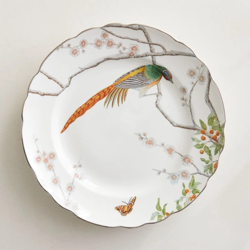 Hand-applied chinoiserie decal and shiny silver rim lend a whimsical touch to fine bone china dinner plate. “We worked really hard to get the delicate profile just right – you get that wedding-china quality without the hefty price tag, or the guilt of using them everyday,” says goop of their dinnerware collection. The pattern of birds and butterflies was inspired by a French take on traditional Chinese motifs. Adds an elegant yet eclectic vibe to everyday meals and special occasions alike. CB2 exclusive.