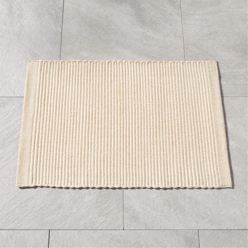 Woven by hand to create subtle texture, sleek natural flatweave rug by Ross Cassidy is a minimalist addition to the indoor or outdoor living area. Ribbed performance fabric is designed to withstand the demands of high traffic, yet retains a decidedly sophisticated aesthetic that looks especially chic when paired with teak outdoor furniture. CB2 exclusive.