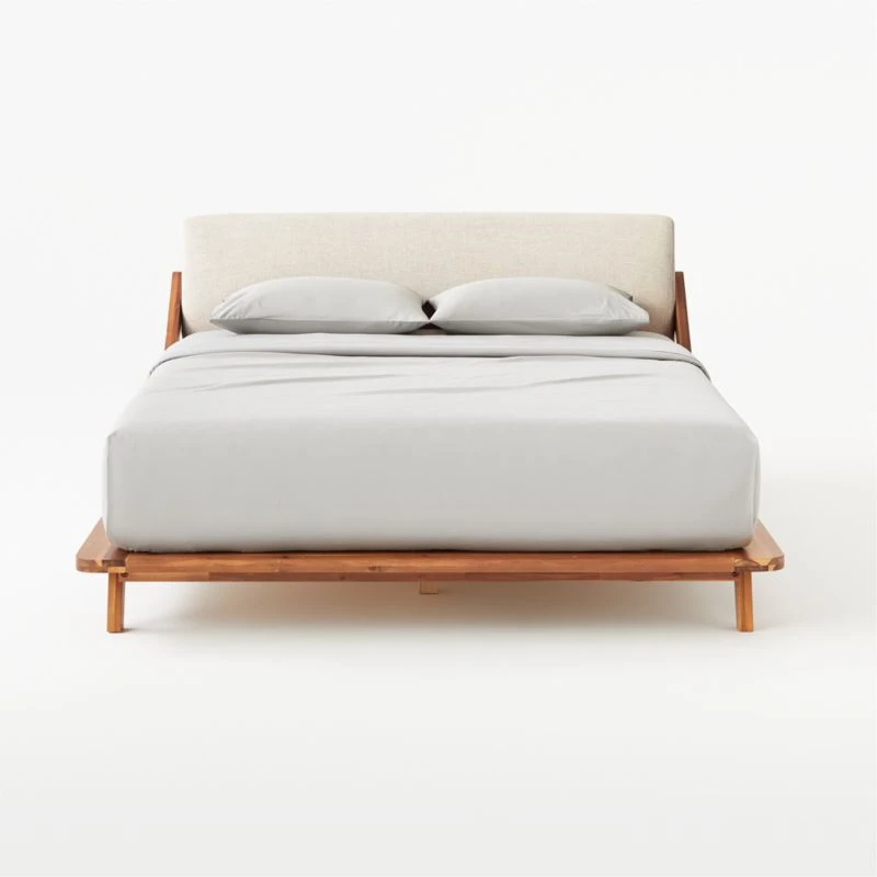 Both architectural and comfy, master wooden bed designed by Jannis Ellenberger is a dream from every angle. Aligned with Ellenberger’s style of simple construction with unexpected details, “the combination of contrasting materials and inclining lines make the design modern and fresh.” With its warm tones and graceful grain, solid sustainable acacia wood intersects angular legs that meet in an open back on low-profile platform—a natural complement to plush upholstered headboard, tailored in an ivory poly/linen weave. Mattress sold separately. Learn more about Jannis Ellenberger on our blog.