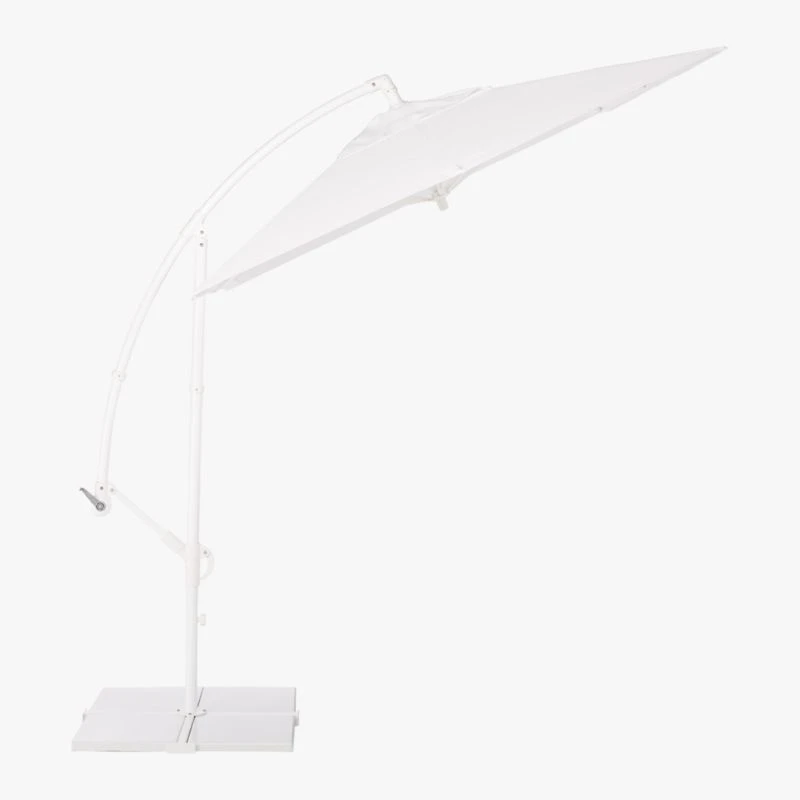Crank open and unfurl a modern square shade in crisp white. Hi-gloss white powdercoated aluminum pole/fittings, matching grid iron base and galvanized hardware are all rust-resistant. Spun polyester umbrella shade is two-meters square and can raise/lower/tilt as need be. Iron base is easy to move. CB2 exclusive.