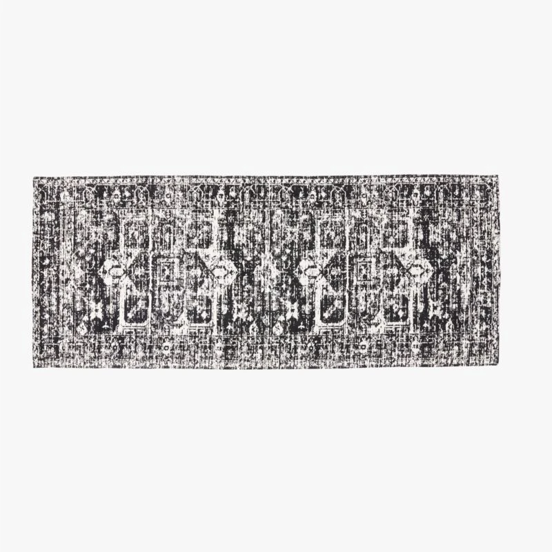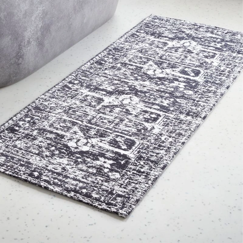 Bath runner goes vintage in a distressed black and white pattern. Cotton/poly blend mat is soft to the touch, with carpet construction on the back so it stays in place. CB2 exclusive.