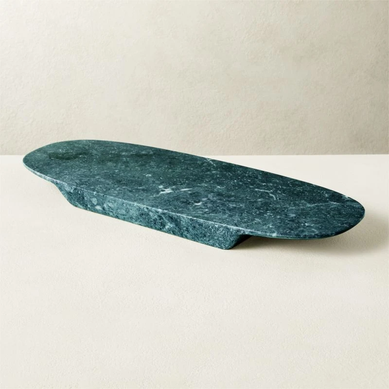 Cut and grinded into a sleek oval, this beautiful green marble server is polished to a fine finish. Base is carved out on each end to significantly reduce the weight of this solid marble piece, making it easier to carry to and from the table. CB2 exclusive.