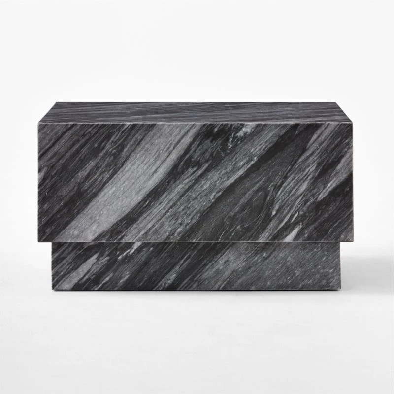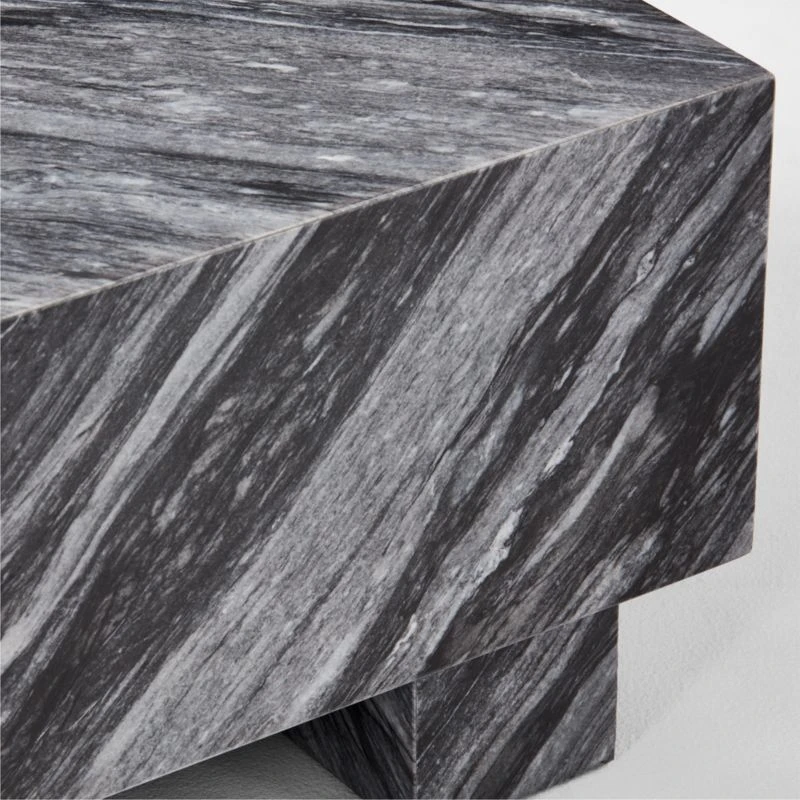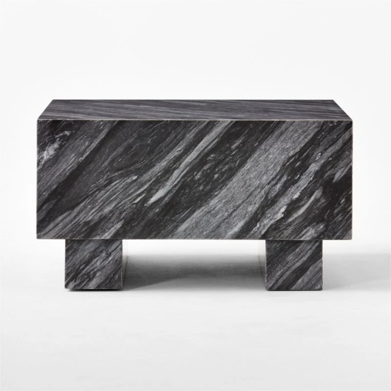 Inspired by ancient post-and-lintel construction, oversized square coffee table by VUUE has a bold, architectural form. Highly active blue Florence marble features prominent veining in cool tones of grey; due to the natural beauty of the stone, each piece is unique. Scaled to complement large sectionals and spacious rooms, this low table makes a graphic statement in its simplicity. CB2 exclusive.