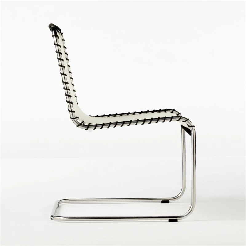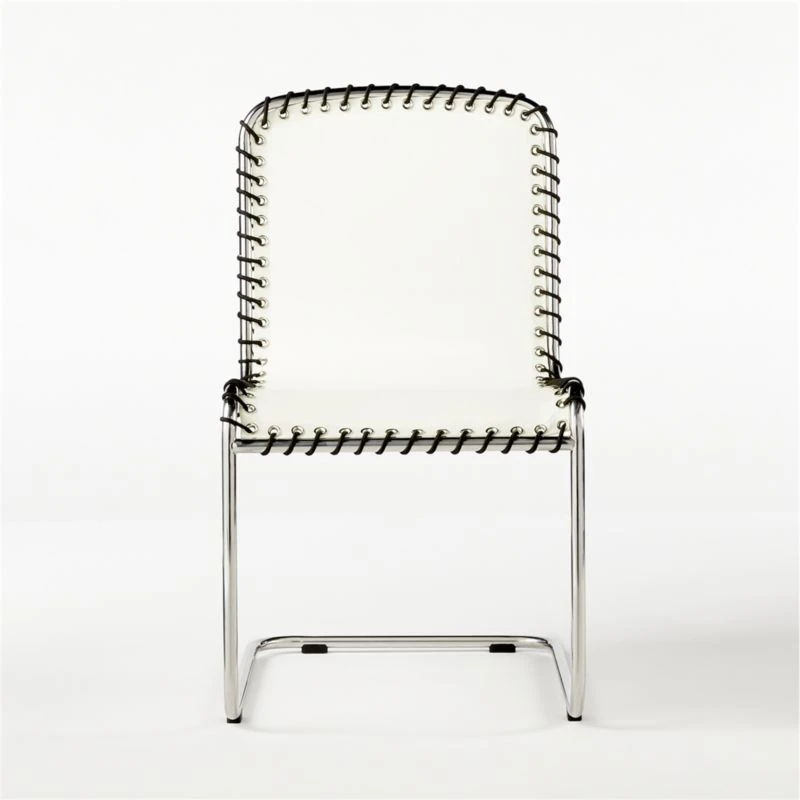 The Enzo collection by Brett Beldock is a study in chic outdoor materials, from its polished stainless steel cantilever frame to the black cording and natural canvas sling. Marine-weight Sunbrella® canvas is heavy-duty and easy to clean. Graphic outdoor chair adds instant sophistication to any outdoor space. Learn about Brett Beldock on our blog. CB2 exclusive.