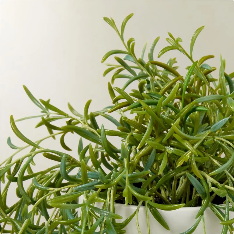Leafy, succulent, vibrant … and no maintenance. Spilling out from the shiny white ceramic pot, this faux String of Bananas trailing plant is greenery made easy. CB2 exclusive.