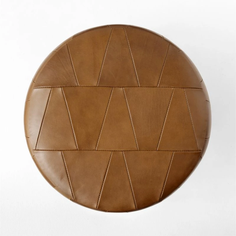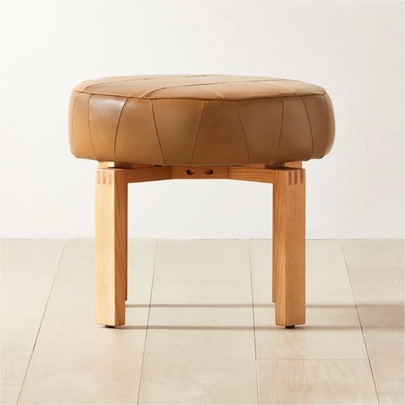 California design duo Lawson-Fenning’s appreciation of craftsmanship and honest materials comes through in low-slung ottoman. Boxy, angular base is made of oak certified sustainable by the Forest Stewardship Council ®, with solid wood legs coming together through exposed box joinery—a sign of high-quality detail borrowed from the Arts and Crafts movement. Atop the four legs, a circular cushion in luxurious caramel leather patchwork plays against the angularity elsewhere in the piece. CB2 exclusive.