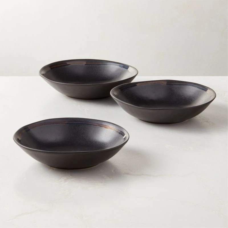 Striking black stoneware pasta bowl is carefully shaped and finished by hand, then given a reactive glaze along its rim. An additional firing achieves a subtle yet eye-catching gloss that reveals understated tonal variations. Each handmade piece will have subtle differences that highlight the artisanal quality and creative process. CB2 exclusive.