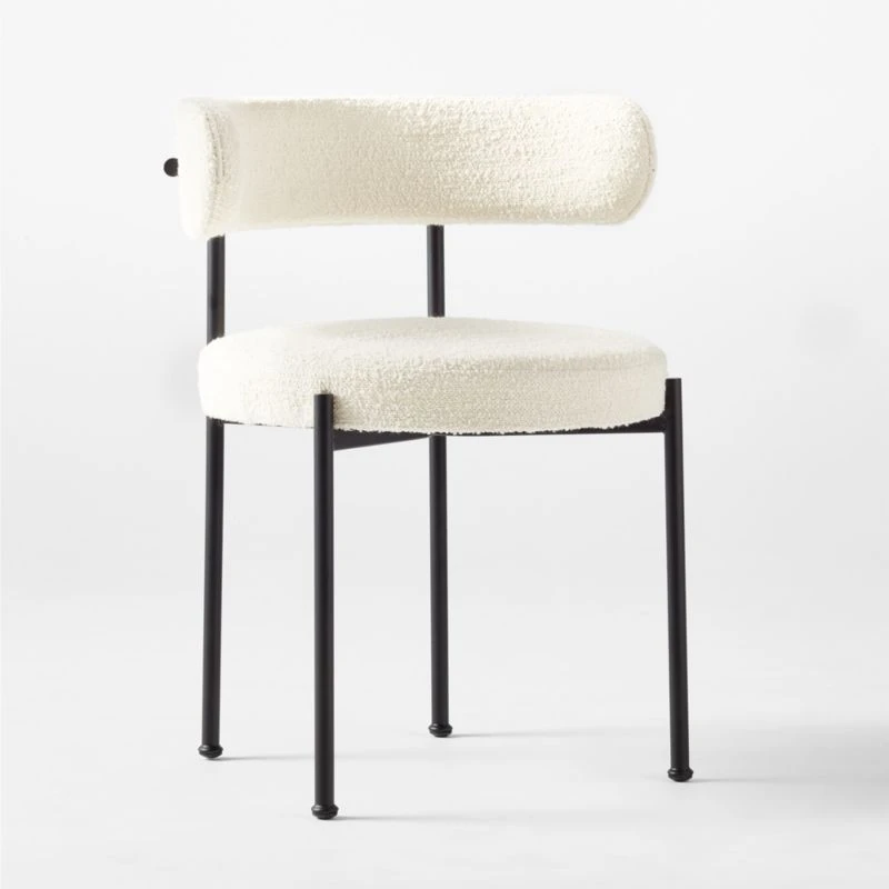 Steel tube with matte black finish frames a modern, Italian-made dining chair. Textural ivory boucle wraps the curved back and round seat in luxe contrast. CB2 exclusive.