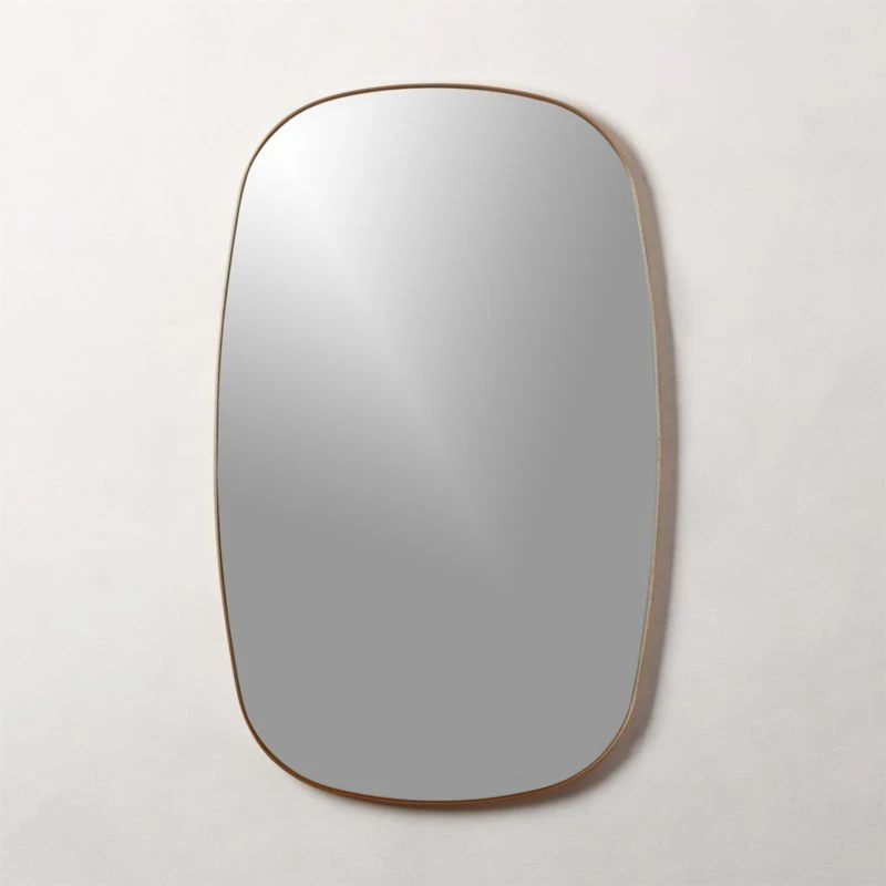 Looking glass framed thin, trim and exact in pure extruded aluminum with brass finish. Handmade oblong frame resists corrosion so mirror is perfect in the bath. Mounting hardware is included. CB2 exclusive.