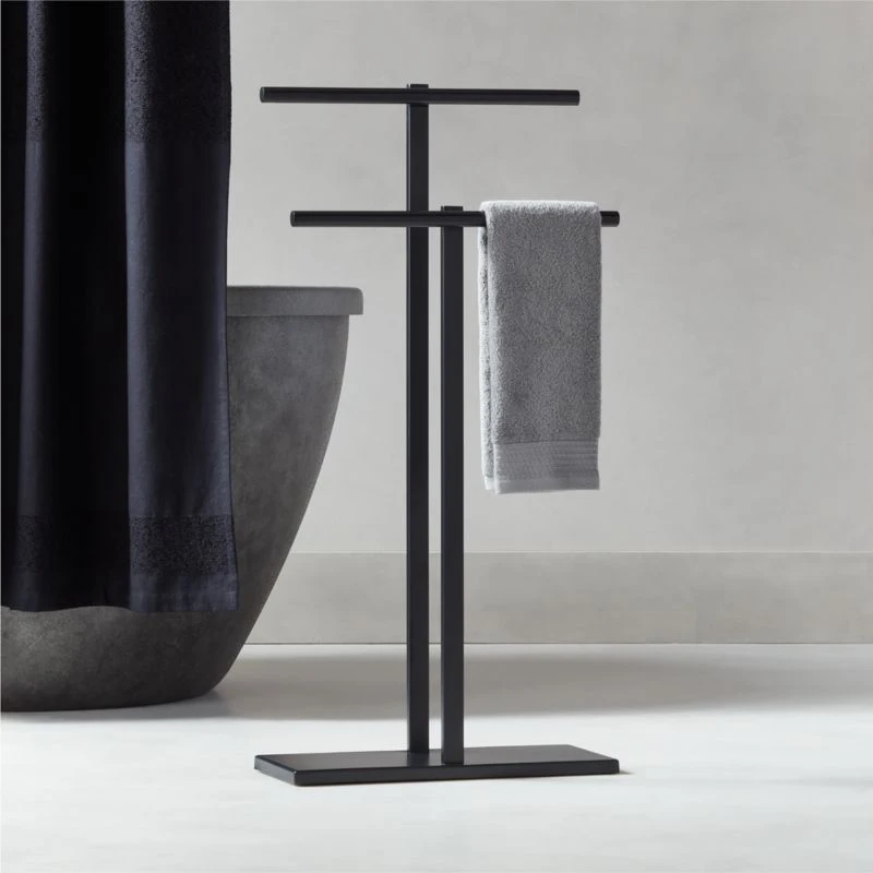 Mermelada Estudio mixes delicate design with solid iron construction in this sleek standing towel rack. Finish adds a modern touch to the bath. Pair with the Kela knobs, handles, hooks and toilet paper holders for a cohesive look. CB2 exclusive.