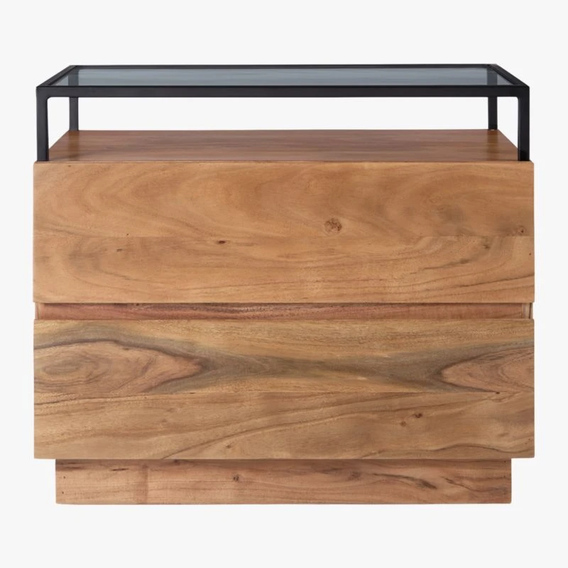 Slim black iron frame floats atop two solid acacia wood drawers and tops nightstand off in clear glass. Best of both storage worlds, open shelf displays jewelry/sunnies/accessories while drawers hold everyday essentials. CB2 exclusive.