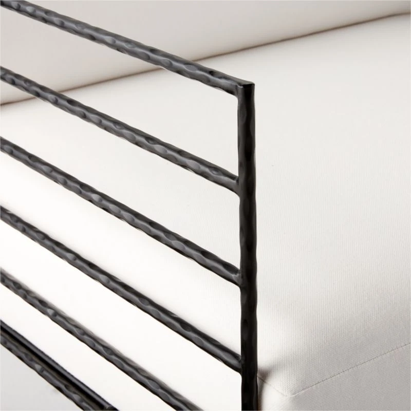From afar, outdoor lounge chair by Mermelada Estudio is well-defined by clean lines and angled geometry. Up close, thoughtful details such as tapered feet and a solid hammered iron frame add a hint of vintage flair. Plush cushions are upholstered in fade-resistant, low-maintenance white Sunbrella ® performance fabric for ease of care and beauty. CB2 exclusive.
