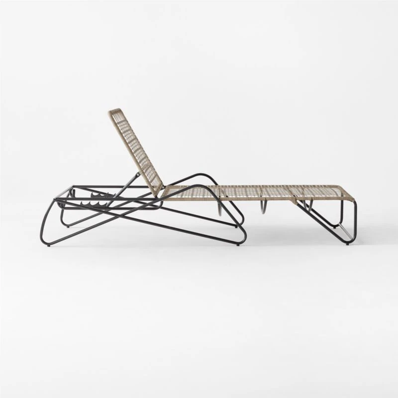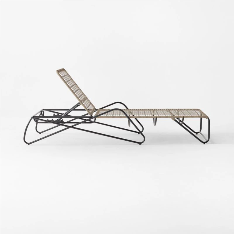 Sinuous sculptural chaise lounge by Brett Beldock is a nod to iconic midcentury outdoor designs made from iron tubing. Bold black lines flow from the arms to the base in winding iron. Paired with a tonal grey resin rattan seat and adjustable back, they create a modern chaise lounge made for relaxing. CB2 exclusive.