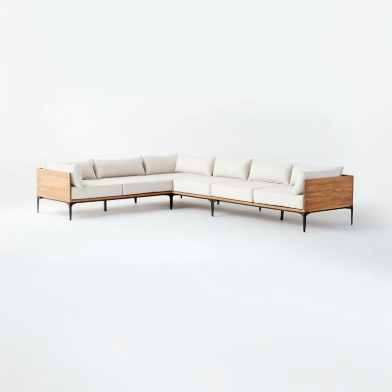 Sophisticated outdoor sectional from Barcelona-based Mermelada Estudio blends certified sustainable teak wood with durable cast metal legs and nubby textured upholstery. A chic mix of materials that takes outdoor furniture to a new level. Soft white cushions feature Sunbrella® performance fabric known for its durability, comfort, ease of cleaning and color stability. The teak wood varies in tone from blonde to amber. When left uncovered, the sectional will patina to a beautiful silvery-grey. Learn about Mermelada Estudio on our blog. CB2 exclusive.