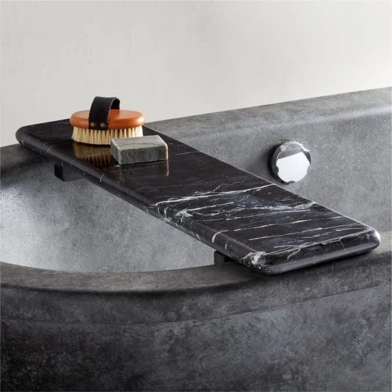 Rich black Marquina marble bath caddy with striking white veining is a luxe addition to the bath. Each is handcrafted in India with a mango wood back that adjusts to fit securely on the tub. Unique color, tone and activity define the piece and instantly elevate your daily soak. Coordinate with the full black Marquina marble bath collection for an extra chic look. CB2 exclusive.
