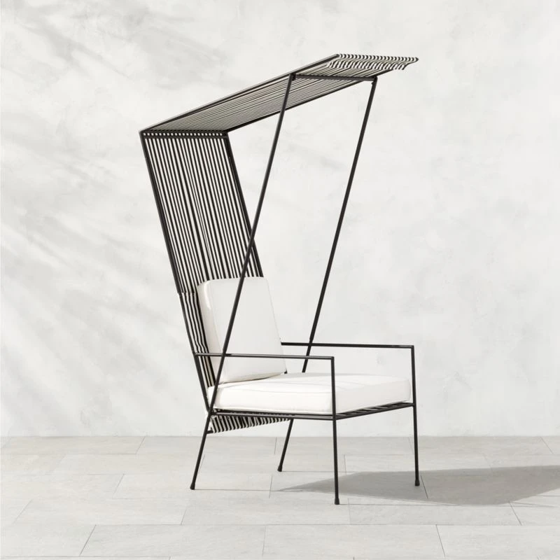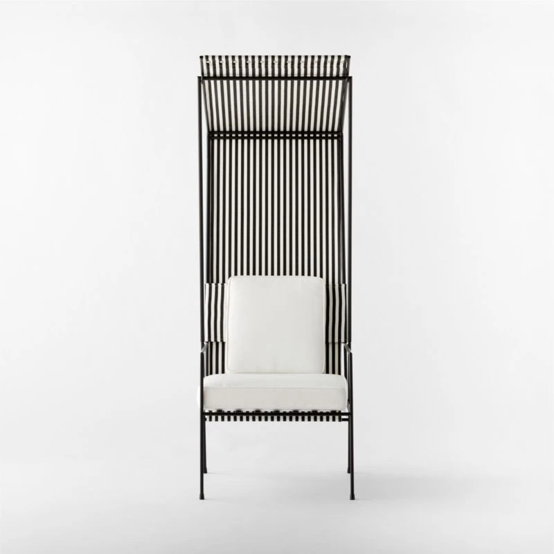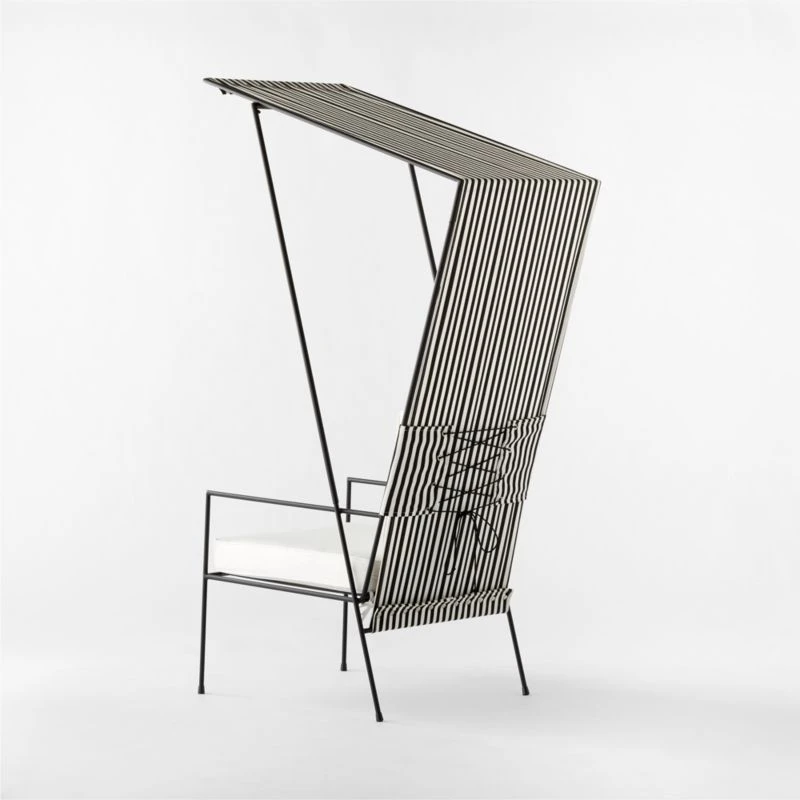 Part of Paul McCobb’s Pavilion Collection, cabana chair stays true to the effortlessly modern details of his original designs. Our reissue introduces bold stripes in a weather-resistant Sunbrella ® performance fabric, evoking the glamour of a vintage resort on the French Riviera. With a satin black iron frame, the vintage shaded silhouette makes a statement in modern outdoor spaces. Pair with the Pavilion Black Metal Outdoor Ottoman for the ultimate spot to lounge. CB2 exclusive.