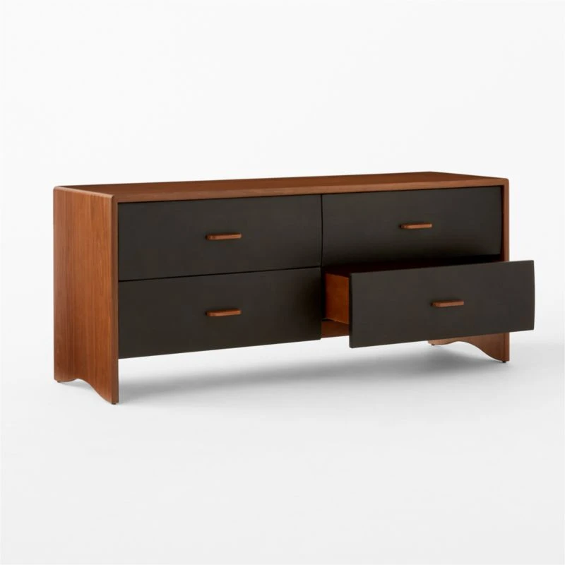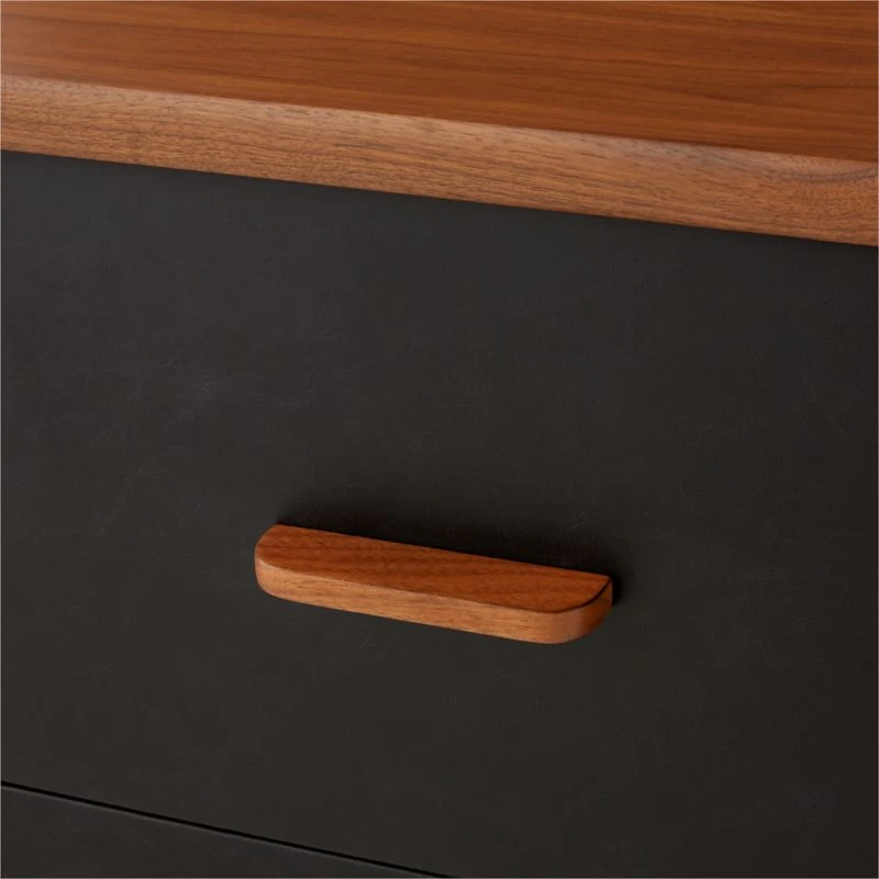 The beauty of simple, natural materials is apparent in Jannis Ellenberger’s low dresser. Its leather drawer fronts will wear beautifully over time, further enhancing the solid walnut handles and walnut frame. Four drawers gently slide along soft-close glides, giving this piece a flawless balance of form and function. CB2 exclusive.