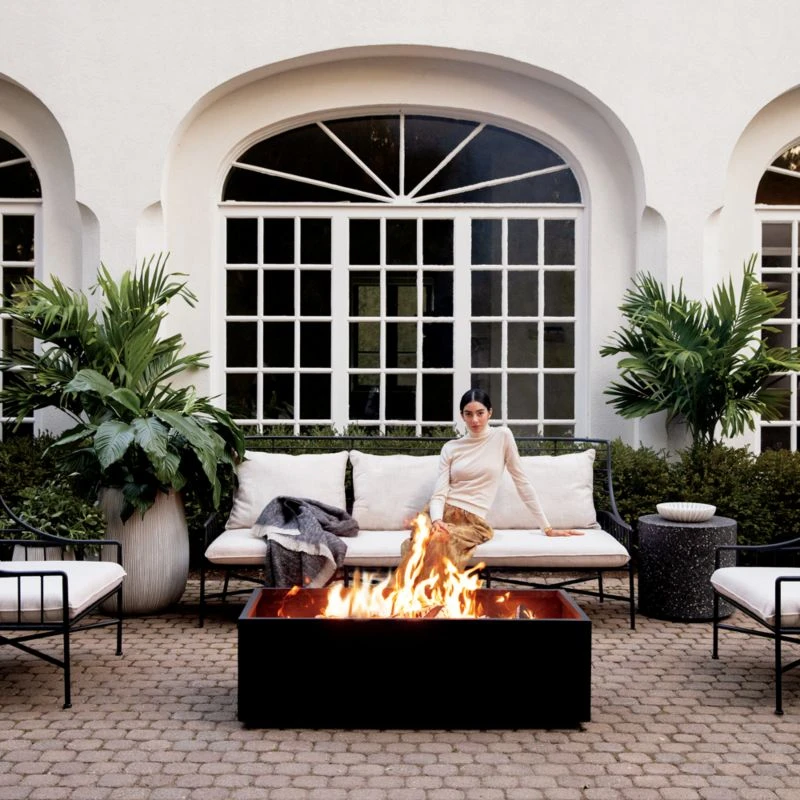 Black iron fire pit lays out four feet of woodburning space to heat up chilly nights. Simple rectangular profile looks sleek with a fire or without. CB2 exclusive.