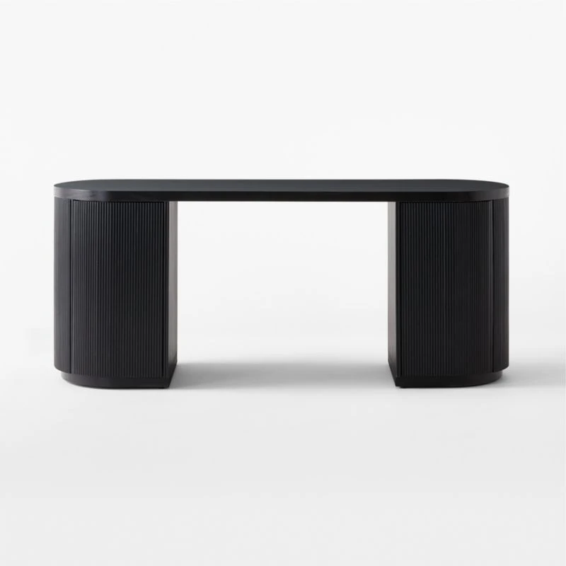 CEO of sophistication, brought to us by Mermelada Estudio. Modern, oversized executive desk in glossy ebonized oak rounds out on either side for maximum storage, one shelf per side. Push-to-open doors curve with the frame and are hidden beautifully with fluted repetition. CB2 exclusive.
