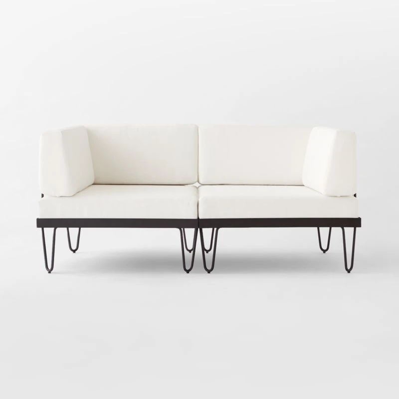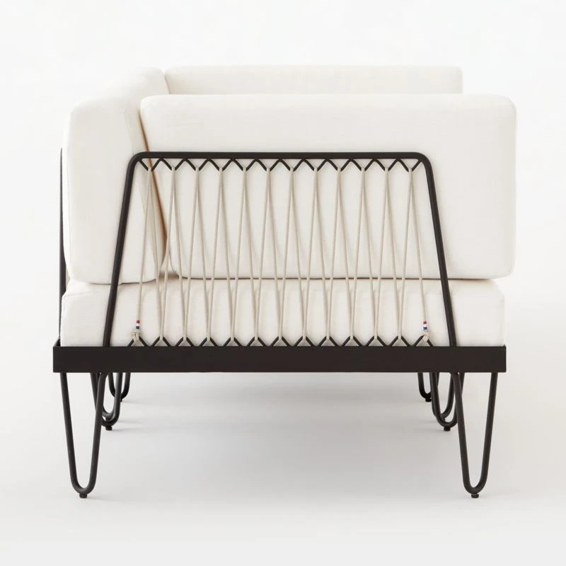 Solid rod frame and legs showcase nautical rope detail in a two-piece outdoor loveseat made for lounging. We couldn’t resist adding a tiny red, white and blue ribbon to the rope—a nod to the piece’s French Industrial inspiration. Soft white cushions feature durable all-weather upholstery. CB2 exclusive.