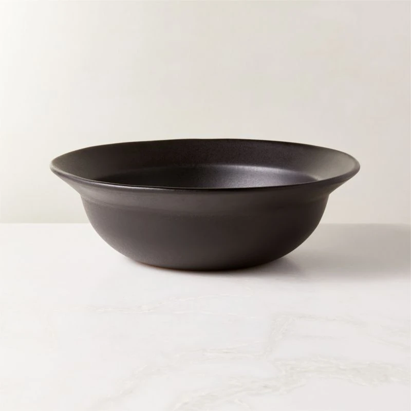 Terra cotta serving bowl is fired with a matte black reactive glaze, surfacing tonal variations and minor imperfections that make each piece unique. Serving bowl has a unique round profile with a flared rim that layers nicely with the other pieces in the Sculpt dinnerware collection. CB2 exclusive.