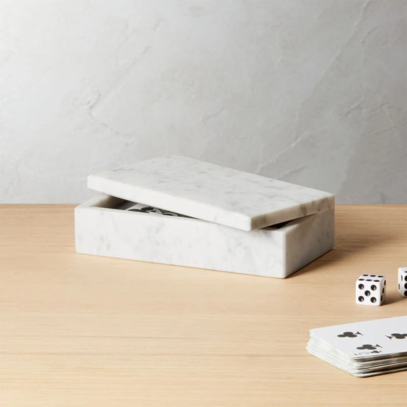 Marble storage box stores knickknacks on dressers or desks. Veining will be unique in each piece due to natural properties of marble. CB2 exclusive.