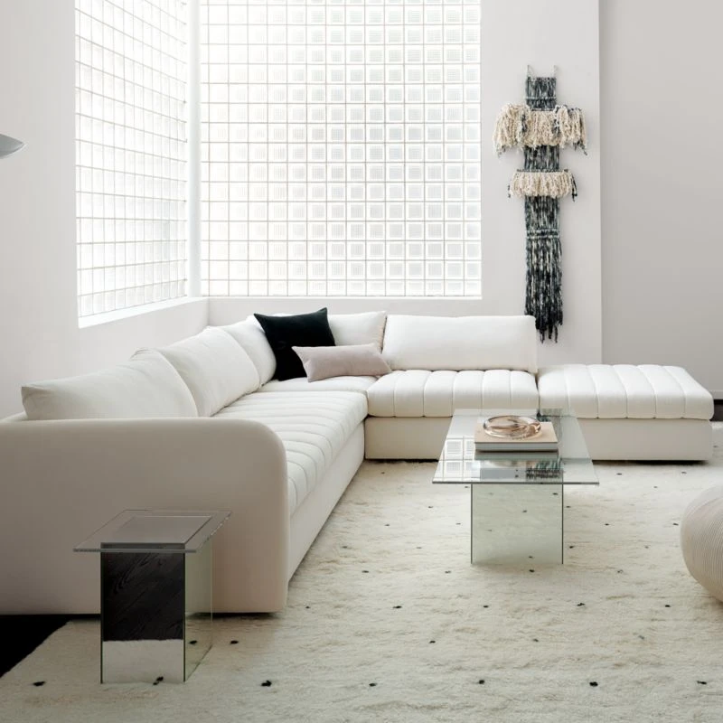 Channel-stitched seat cushions create a domestically crafted ottoman that’s big on both comfort and style, all upholstered in natural cotton. “I’m all about the lounge,” confesses designer Kara Mann. “This collection features a softer take on upholstery in general: a little deconstructed, a little bit more casual.” CB2 exclusive.