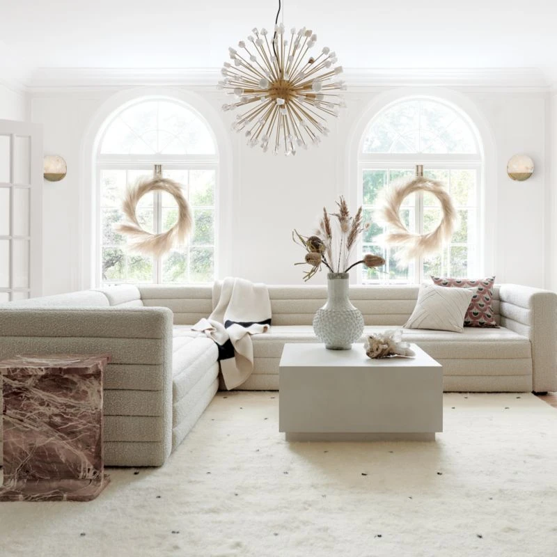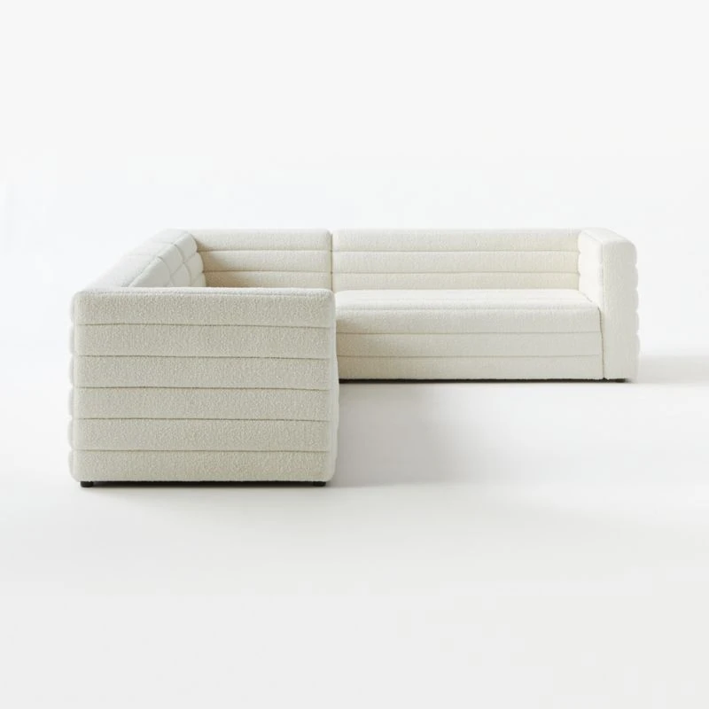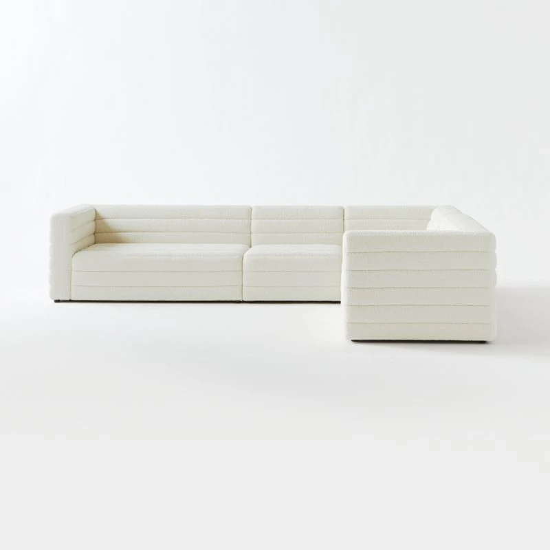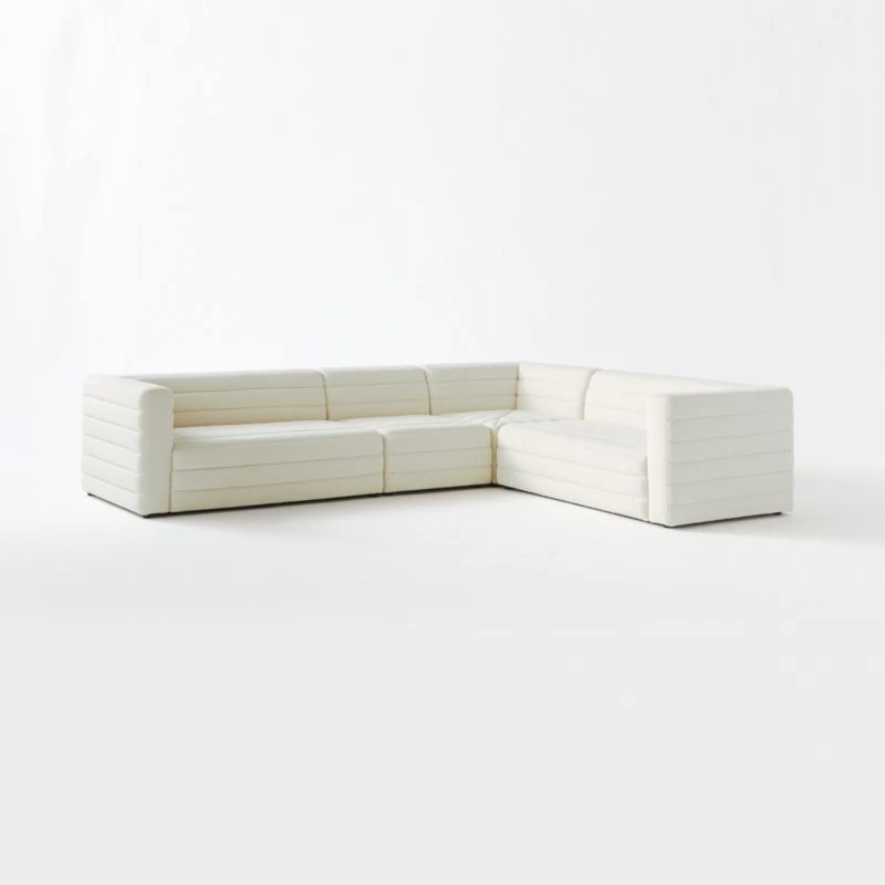 Meet Strato. Designed by Mermelada Estudio, this vintage ’70s-inspired sectional sofa is upholstered in soft white boucle with plush channel tufting on all sides. “Cozy” doesn’t do it justice. Learn more about Mermelada Estudio on our blog. CB2 exclusive.