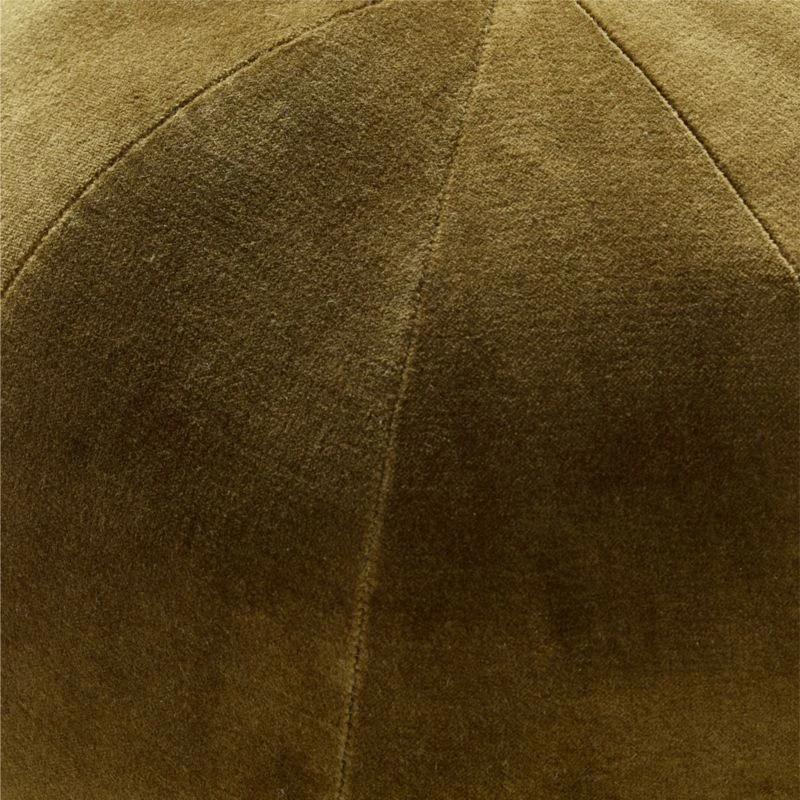 Dyed a rich olive green, velvet sphere pillow is an unexpected, elegant addition to the bed or sofa. Tonal seams add a luxe design detail while the unique shape adds contrast and texture to your pillow collection. We stuffed this one for you—no insert needed. CB2 exclusive.