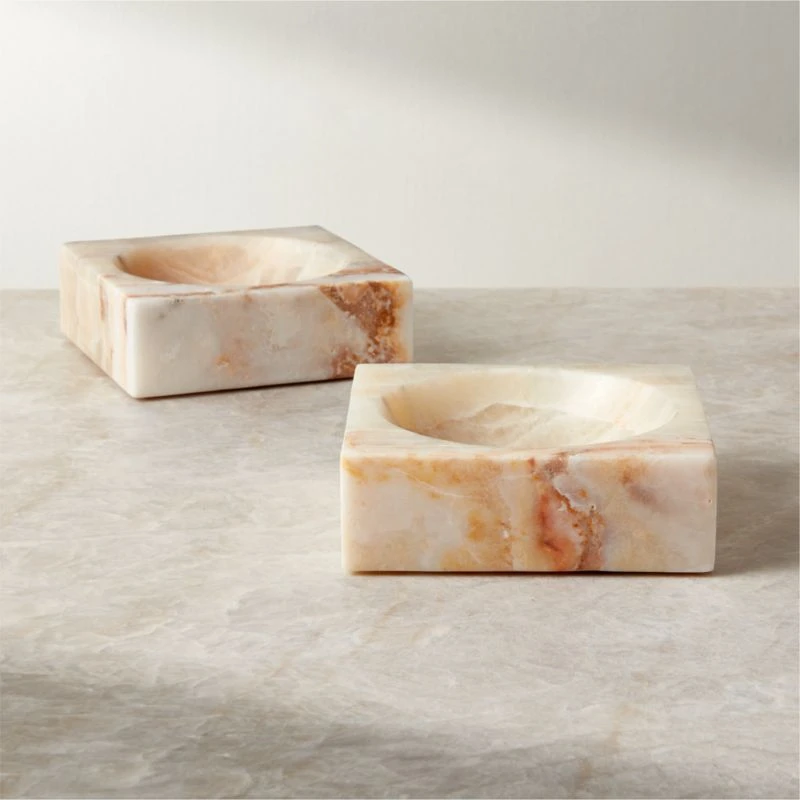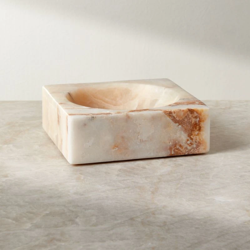 Solid honed onyx takes shape as a stunning catchall dish, carved in the center to hold a host of small items. Organic variations in tone and veining of onyx means that each will be naturally one of a kind. CB2 exclusive.