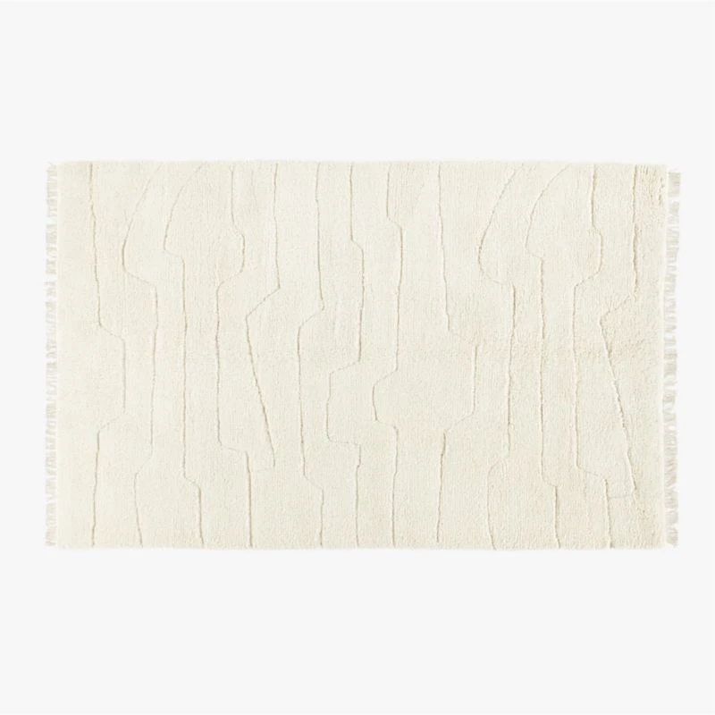 Designed by Studio Anansi, pure New Zealand wool weaves a plush shag edged in ivory fringe. Skilled artisans knot strands of New Zealand wool in an abstract horizontal pattern over the tonal ivory warps of the rug. With 11–12 knots per square inch, the naturally soft yet durable weave holds up in medium-traffic areas. CB2 exclusive.