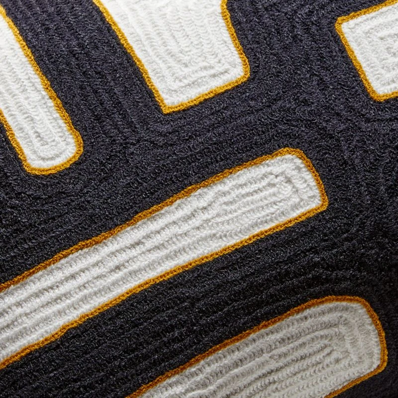 Ancient artistry meets contemporary design in this embroidered cotton/linen throw pillow. Through intricate crewel embroidery—a technique dating back 1,000 years—a modern geometric pattern comes to life. The monochromatic palette of white and black is accentuated by a subtle tapenade embellishment outlining the shapes. CB2 pillows include a pillow insert in your choice of feather down or down alternative. CB2 exclusive.