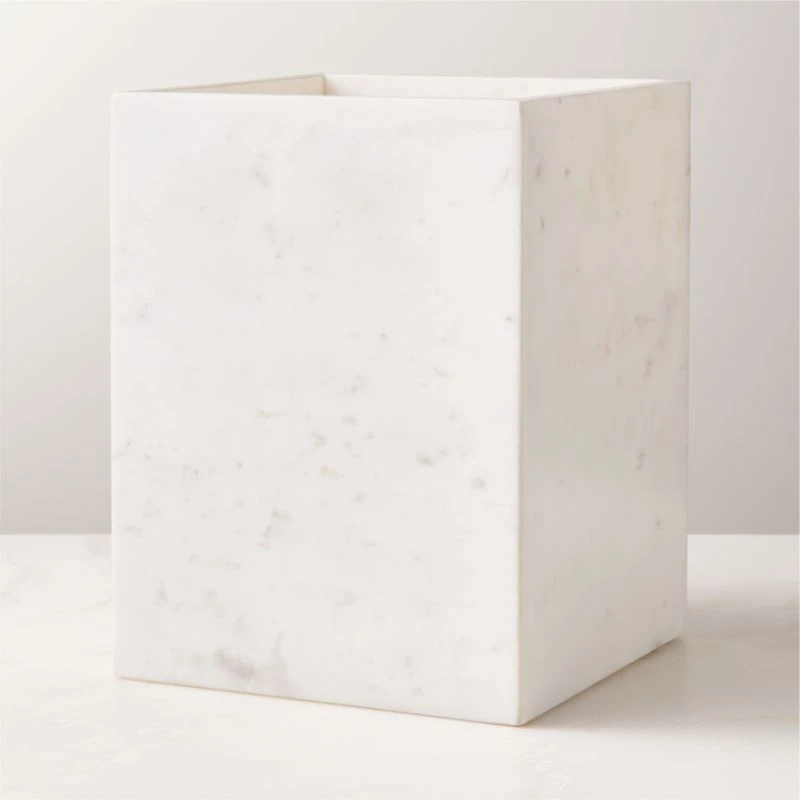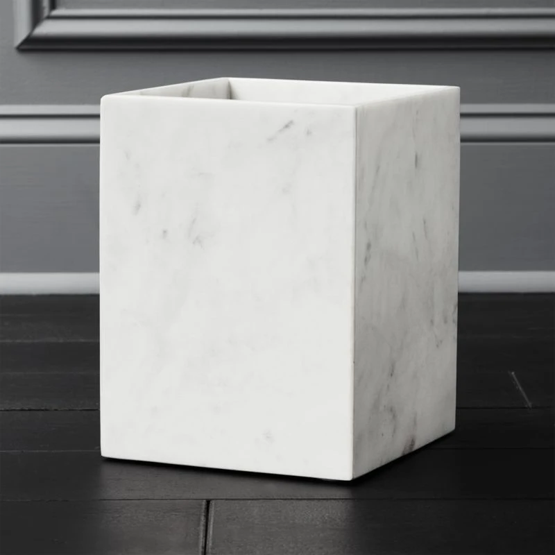 Carves out a neat spot in the bath. Honed smooth in soft white with naturally occurring swirls of grey, marble wastebasket squares away rubbish in style. CB2 exclusive.